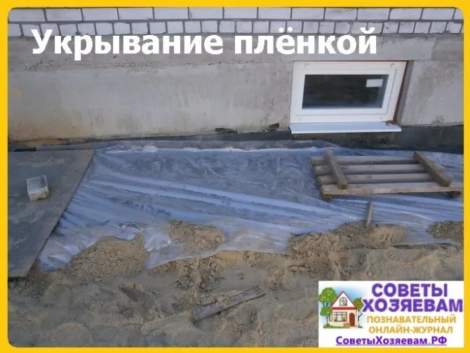 После заливки отмостки, бетон укройте пленкой, во избежание пересыхания под солнцем или, наоборот, размыванием при дожде.