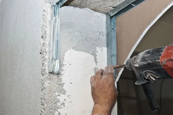 С помощью ножниц по металлу из обычного профиля изготавливается дугообразный. Для этого нужно сделать надрезы и согнуть его до желаемой формы. Готовая деталь крепится дюбелями к направляющим и саморезами к гипсокартону. Между дугами можно добавить отрезки профилей, это обеспечит дополнительную жесткость.