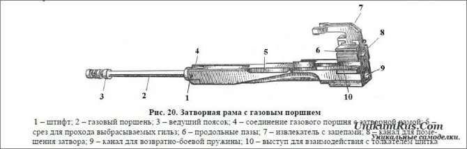 Затворная рама с газовым поршнем (рис. 20) служит для приведения в действие затвора и для извлечения патронов из ленты при заряжании. В задней части затворной рамы закреплен извлекатель 7 с зацепами.