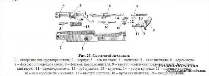 Спусковой механизм (рис. 23) состоит из корпуса 2, шептала 4, пружины 18, оси 3 шептала, коромысла 6, кулачка 13, осей 16 кулачка и коромысла, предохранителя 11 и фиксатора 7 предохранителя с пружиной. Шептало удерживает затворную раму на боевом взводе.