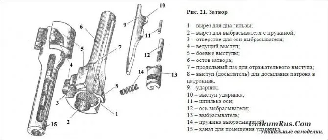 Затвор (рис. 21) служит для досылания патрона в патронник канала ствола, разбивания капсюля и извлечения гильзы из патронника. Он состоит из остова 6, ударника 9, выбрасывателя 13 с пружиной 14 и осью 12 со шпилькой 11.