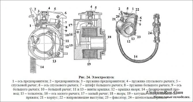Электроспуск (рис. 24) состоит из катушки 19 электромагнита, якоря 18 с толкателем 15, малого рычага 17, крепящегося на оси 16, большого рычага 10, установленного на оси 9, спускового рычага 5 с пружиной 4, предохранителя 2 с флажком и пружиной 3. В корпусе электроспуска помещаются: электромагнит, якорь, толкатель, большой рычаг с пружиной, малый рычаг, спусковой рычаг с пружиной и предохранитель спускового рычага с пружиной. Якорь при подведении электрического тока к электромагниту приводит в движение толкатель, который поворачивает малый рычаг. Под действием малого рычага нижний конец большого рычага продвигается вперед, поворачивая кулачок. Поворот большого рычага вручную производится выступом спускового рычага. Предохранитель спускового рычага служит для запирания спускового рычага, что исключает производство случайного выстрела. Снаружи корпус имеет: направляющие выступы; вертикальный и горизонтальный пазы; проушину и окно для спускового рычага; проушину для предохранителя спускового рычага; крышку электромагнита; ввод для бронированного провода.