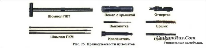 Шомпол применяется для чистки смазки канала ствола, патрубка газовой каморы, трубки поршня, канала затворной рамы, а также каналов и полостей стольной коробки и других частей пулемета. Шомпол состоит из трех звеньев, свинчиваемых друг с другом. На одном конце он имеет головку для соединения с пеналом (шомпол пулемета ПКТ на одном конце имеет ручку), на другом — щель для продевания ветоши или пакли и резьбу для навинчивания протирки или ершика. Протирка применяется для чистки и смазки канала ствола. Ершик применяется для чистки раствором РЧС и для смазки канала ствола. Отвертка и выколотка применяются при разборке, сборке и чистке пулемета. На отвертке имеются: две кромки для чистки патрубка газовой каморы, вырез (ключ) на торце для ввинчивания (вывинчивания) мушки и боковой вырез для закрепления протирки на шомполе. Пенал служит для хранения протирки, ершика, отвертки и выколотки. Он закрывается крышкой. Пенал применяется как рукоятка шомпола при чистке пулемета и отвертки при ввинчивании (вывинчивании) винтов и мушки. Пенал имеет два круглых отверстия для присоединения шомпола, овальное и прямо¬угольное отверстия; для присоединения отвертки. Извлекатель применяется для удаления из патронника оставшейся части гильзы в случае ее поперечного разрыва. Масленка размещается в прикладе. Она имеет крышку с ершиком для смазки частей пулемета. Масленка к пулемету ПКТ служит для хранения смазки и переносится в сумке.