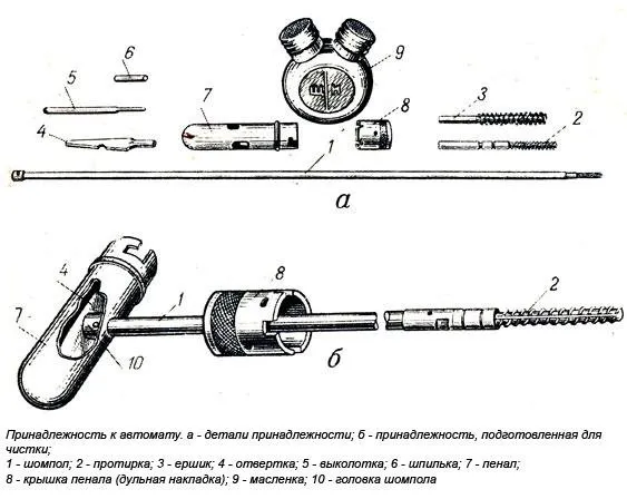 Принадлежности для чистки автомата хранятся в пенале, который спрятан в гнезде приклада. Чтобы достать, нужно утопить палец руки в гнездо и нажать на цилиндр до извлечения такового.