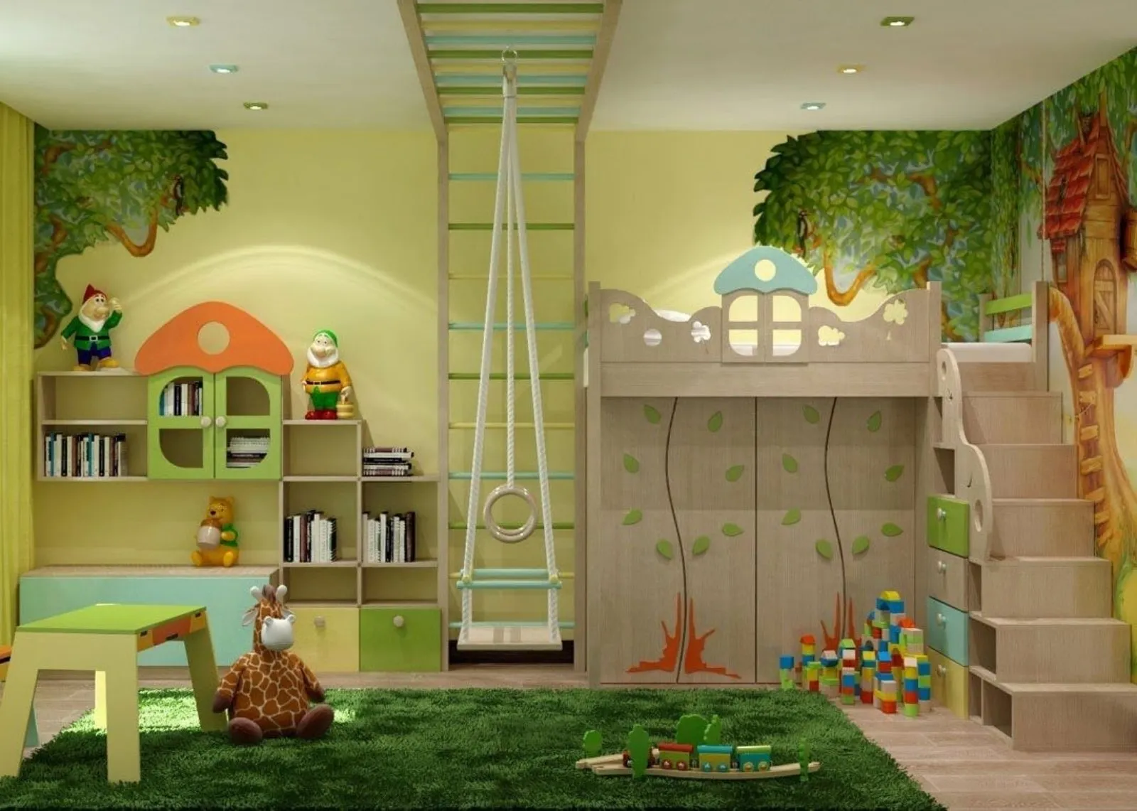 - Зеленый. Подойдет как активному ребенку, так и спокойной девочке. Этот цвет помогает расслабиться, обеспечивает хороший сон, а также прилив сил. Такую комнату легко оформить тематически, к примеру, в стиле леса из сказки, зоопарка с животными или используя другие стилистические решения.