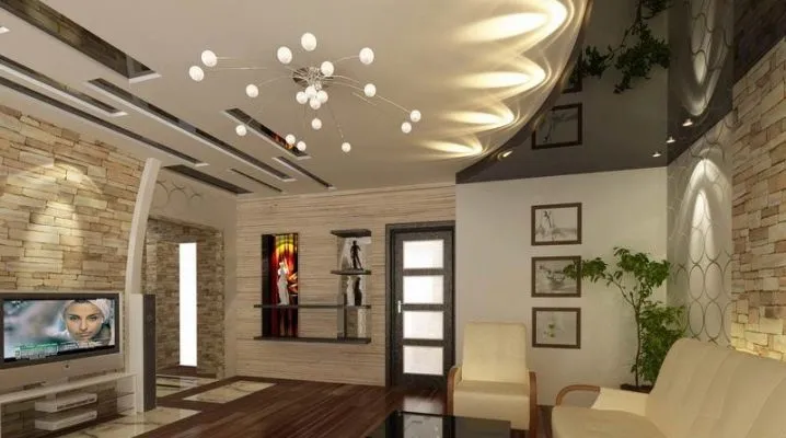 Современные потолки в гостиной также оформляют и в виде сложных конструкций, которые бывают: