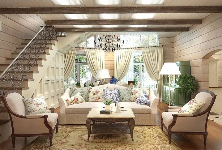 - Кантри. Максимально приближен к природе и не терпит излишеств. Для него также применяют потолки из деревянных балок, из которых выкладывают необычные формы. Цветовая гамма выбирается пространственная, и в ней преобладает желтый, бежевый, коричневый и светло-шоколадный оттенок.