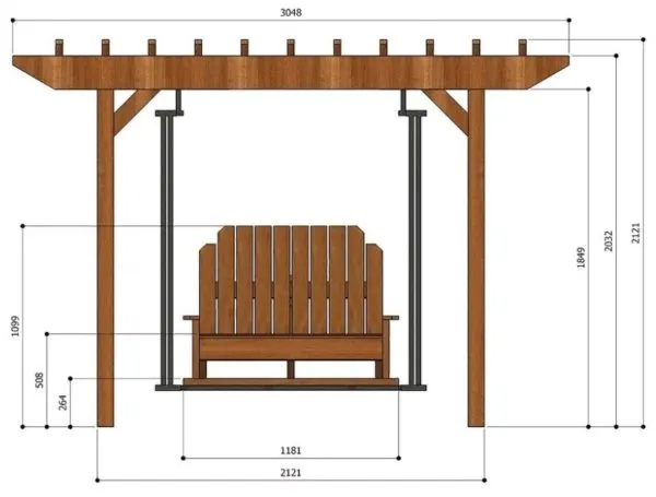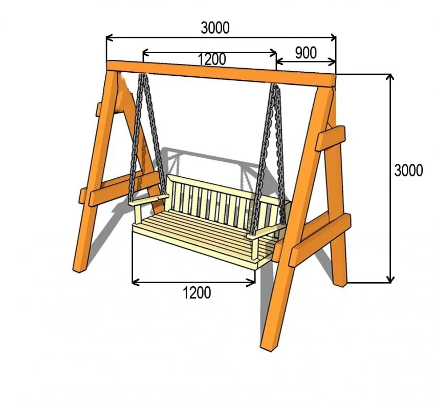 Каркас делают такой же формы, как для металлоконструкций. Для постройки качели выбирают модель, делают её схему. Перед черчением решают какой вид дерева будет применяться.