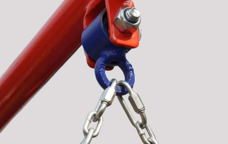 В перекладине просверливают отверстие, в него вставляют болт, к которому крепится рым–гайка. При помощи соединительного кольца подвешивают скамью. Соединение периодически смазывают, чтобы избежать повреждения механизма, скрипа.