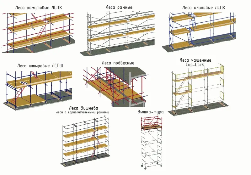 В ППР всегда чётко обозначается, какой вид лесов будет использоваться. Известно несколько видов подобных конструкций: хомутовые, «стойки-ригели», леса строительные рамные и клиновые.
