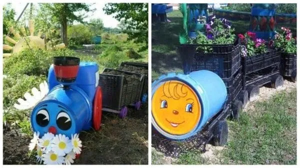 Кроме того, пластиковый контейнер удачная идея для воплощения самой безумной идеи с клумбой. Посмотрите, как необычно, оригинально смотрится паровозик с его вагонами-клумбами. Можно придумать и другие архитектурные формы.