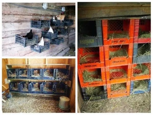 Интересная находка – это использование пластиковых ящиков для обустройства курятника. Размер подходит для самих наседок, да и выглядит конструкция весьма привлекательно. К тому для создания курятника не придется тратить силы, а также средства на покупку дорогостоящих материалов.
