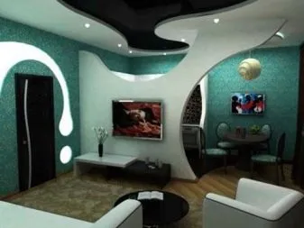 Это уже дизайнерские изыски. Могут состоять из нескольких поверхностей перекрытий, каждая из которых имеет свою форму и высоту. Это радикально современный вариант, подходящий для помещений большого метража и своеобразного декора. В других жилищных условиях будет смотреться странно, а то и просто комично.