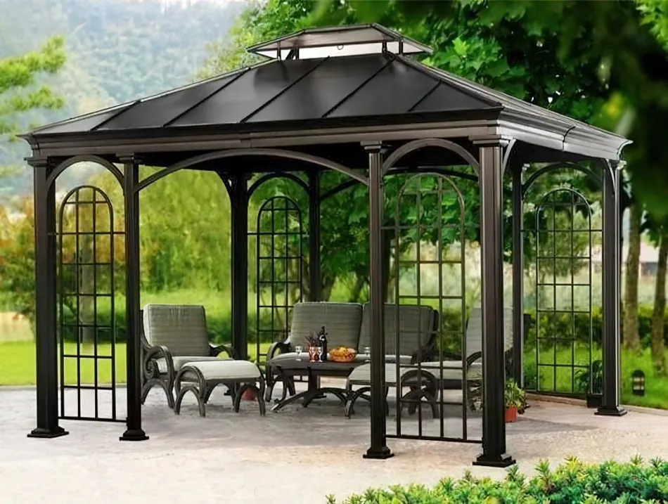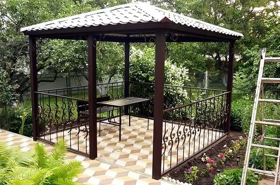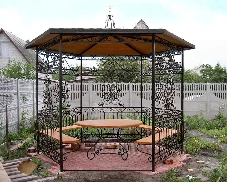 Металлические конструкции с коваными элементами способны придать участку элегантность, утончённость и создать эффект лёгкости. В целом такие беседки достаточно прочные и надёжные, однако имеют ряд минусов.