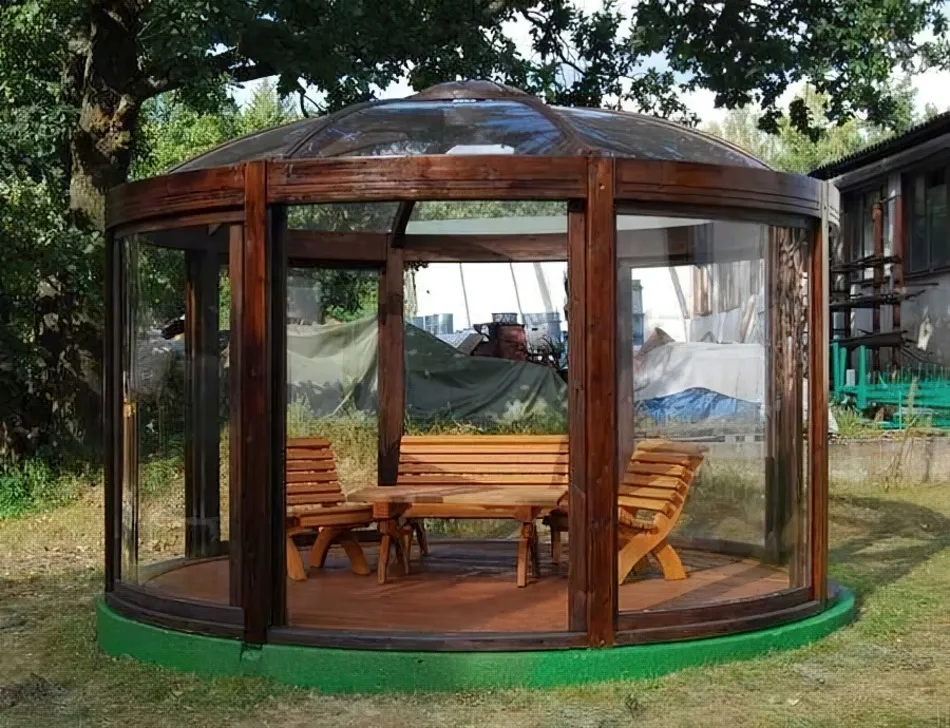 Поликарбонат. Этот материал популярен среди садоводов, которые хотят создать на своём участке эффектное и стильное место для отдыха. В работе поликарбонат достаточно лёгкий и манёвренный, однако такая беседка из поликарбоната будет не долговечна. Это связано с ограниченным сроком службы материала: он пересыхает под воздействием прямых солнечных лучей и трескается.
