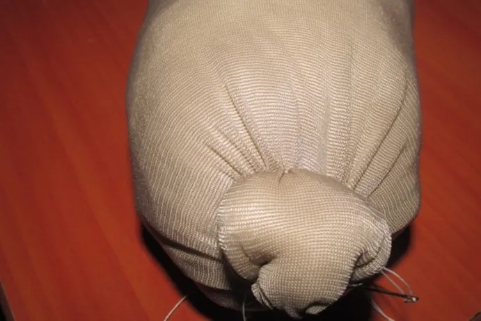 Начинаем с носа. Для этого прошиваем нашу заготовку в нужных местах, стягивая ее нитками.