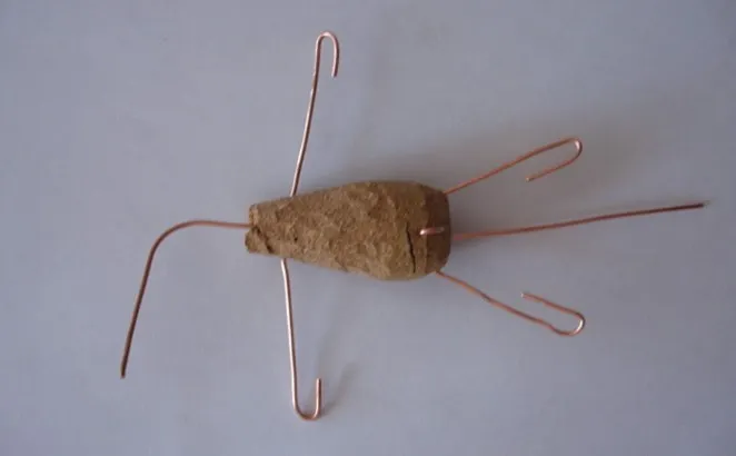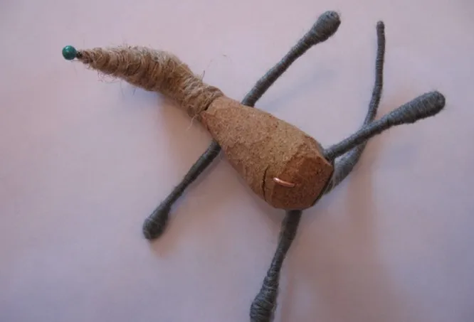 С разных сторон втыкаем в нее 6 кусочков проволоки (1.5 мм в диаметре). Эти кусочки — голова, лапки и хвост.
