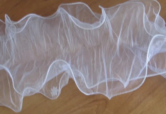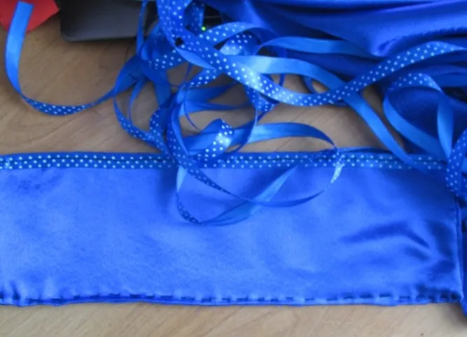 Из куска яркой ткани шьем высокий воротник. Точных размеров нет, потому что величина игрушки у каждого будет разной. Украшаем его по краям лентами. Из этих же материалов делаем мантию.