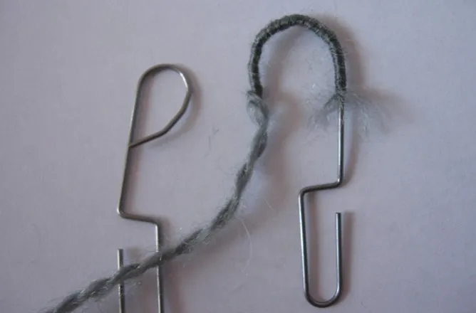 Чтобы сделать ушки, берем две канцелярские скрепки и сгибаем так, как показано на фото. Тоже обматываем их ниткой.