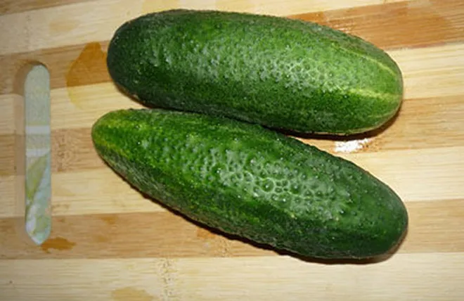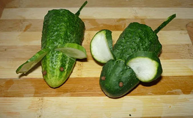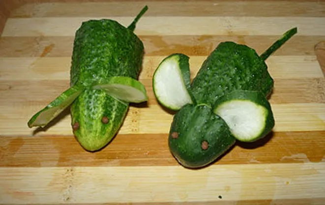 Разрезаем один огурец на две части, как показано на фото. Из второго делаем ушки и хвостики (тонкие полоски).