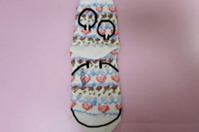 Берем носок, выворачиваем его наизнанку и маркером либо мягким карандашом рисуем на нем вот такие детали. Это туловище и ушки.