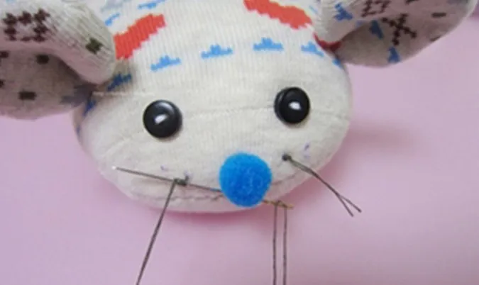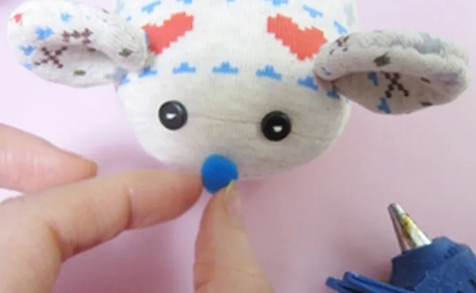 Вырезаем из материала глазки, ушки и носик. Приклеиваем их к поделке.