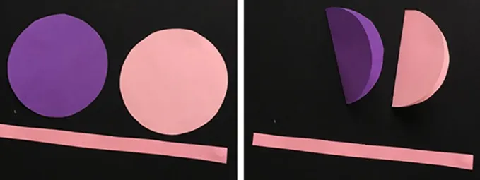 Вырезаем из цветной бумаги два круга. Они могут быть разных цветов или одинаковыми, но главное — должны быть равными по размеру. Также нам понадобится полоска, тоже из бумаги. Складываем кружки пополам.