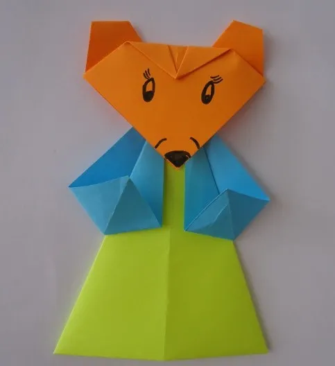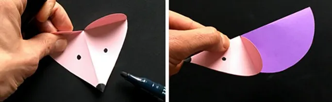 Загибаем у сердца два верхних краешка. Это ушки. Черным маркером рисуем на мордочке носик и глаза.