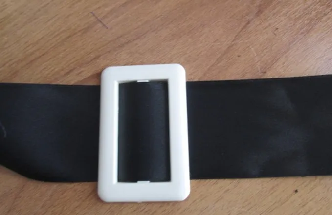 Из широкой черной ленты и пластиковой бляшки делаем настоящий пояс.