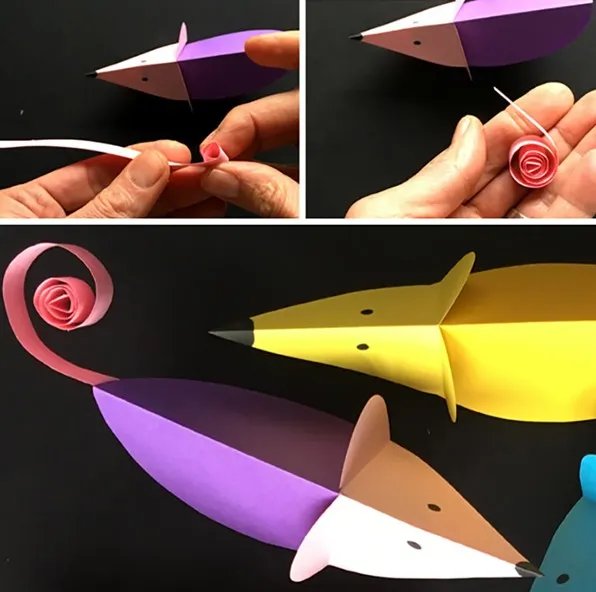 Приклеиваем мордочку к туловищу. Из полоски цветной бумаги скручиваем хвостик. Тоже приклеиваем его.