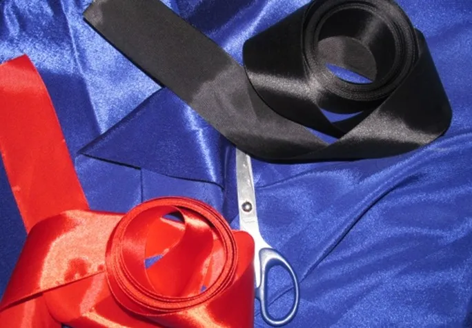 Широкая красная лента и пуговица превращаются в красивую ленту, которую можно перекинуть через плечо.