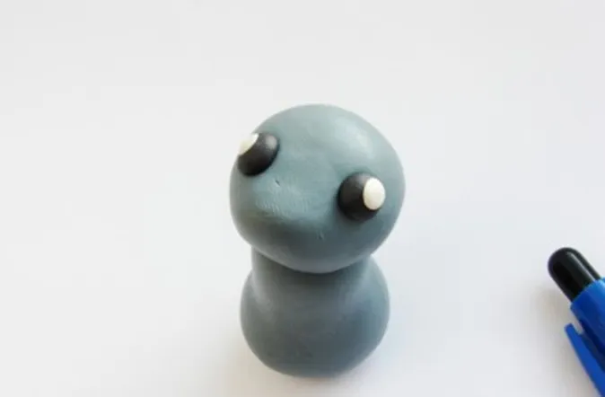 Каждый глазик делаем из шарика белого и шарика черного пластилина. Слегка приплющиваем их, а после вставляем в ямки.