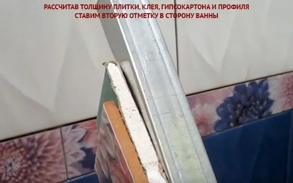 Затем рассчитайте толщину экрана, исходя из толщины слоев конструкции: плитка + плиточный клей + гипсокартон + направляющий профиль. В сумме получается 5 см. Именно на таком расстоянии от первой отметки следует сделать вторую (в сторону ванны). Через вторую отметку, используя уровень, проведите вертикальную черту на стене.