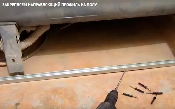 Перпендикулярно установленной стойке уложите на пол отрезок профиля вдоль ванны и прикрепите его к полу дюбель-гвоздями.