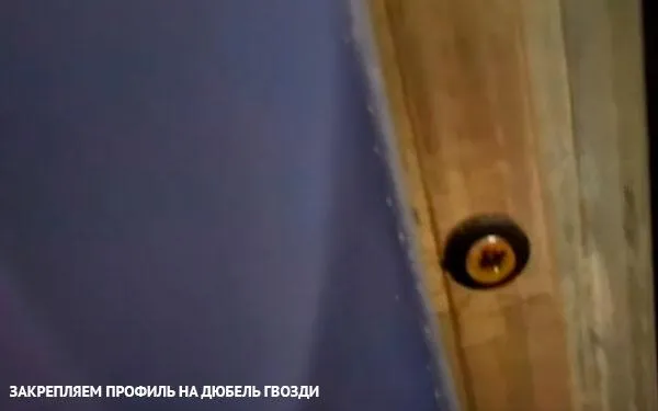 Профиль крепится дюбель-гвоздями, при этом по вертикальной отметке на стене выставляется задняя стенка профиля. Для установки дюбелей сначала просверлите профиль, сделайте соответствующие отверстиям отметки на стене и затем просверлите в ней отверстия под крепеж. Закрепите вертикальную часть каркаса.