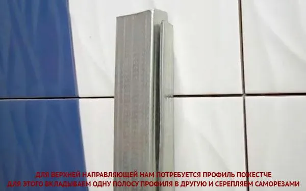 Следующий этап – монтаж всех вертикальных стоек из несущего профиля. Соблюдайте шаг установки согласно подготовленному чертежу, в первую очередь это касается стоек, на которые крепится ревизионный люк. Нижняя часть стойки вставляется в профиль, закрепленный на полу. С верхней части стойки срезаются ребра, а оставшаяся плоская часть крепится к верхней горизонтали саморезом с пресс-шайбой.