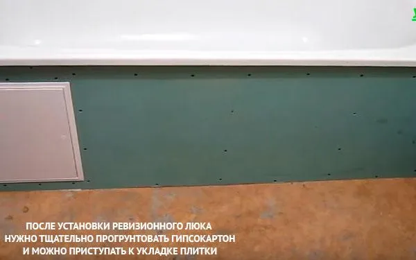 После установки ревизионного люка экран под ванну готов к облицовке. Перед тем как клеить плитку поверхность гипсокартона следует прогрунтовать, используя грунтовку глубокого проникновения, которая улучшит сцепление плиточного клея с поверхностью и не даст влаге впитаться в пористый материал. Грунтовка наносится широкой мягкой кистью в два слоя с промежуточной сушкой.