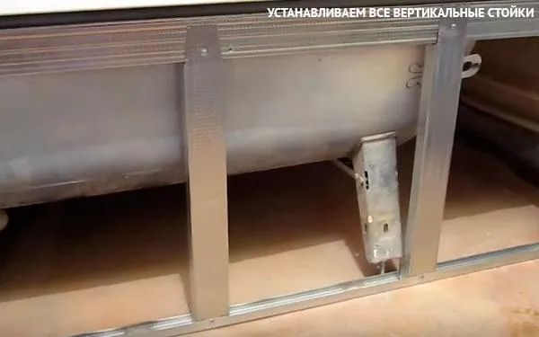 Монтаж экрана под ванну из гипсокартона начинается с крепления каркаса. Ножницами по металлу отрежьте кусок направляющего профиля, его длина должна соответствовать расстоянию от пола до бортика ванны.