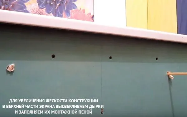 Обратите внимание – в центральной части верхняя часть экрана, находящаяся на весу, немного «гуляет», и ее желательно плотно зафиксировать. Это можно сделать при помощи монтажной пены. Просверлите в двух-трех местах отверстия (они должны располагаться немного ниже горизонтального профиля) и задуйте туда пену. Она расширится и прикрепит профиль к корпусу ванны.