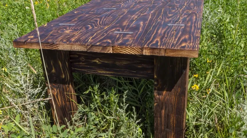 Необычный столик “под старину” можно сделать из самых обычных досок. Перед работой стоит запастись терпением, усердием и огнетушителем на всякий случай.