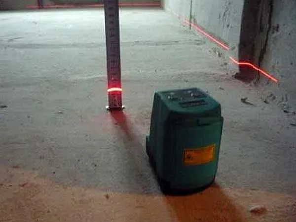 При помощи той же горизонтальной поверхности можно проверять и насколько ровно выложен бетон в стяжке. Луч будет виден на буграх, а впадины можно найти при помощи рейки.
