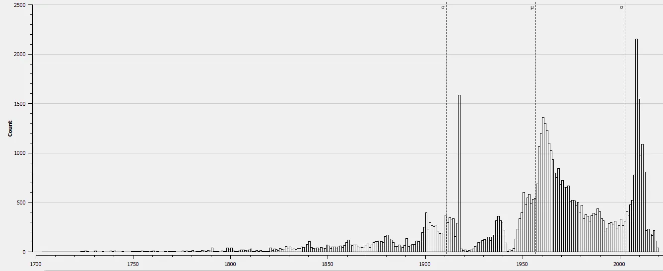 Сразу бросаются в глаза два пика — 1917 и 2008 год. Провалы после революции, Великой Отечественной войны и распада Советского союза — логичны и читаемы. Как быть с двумя выбросами? Гипотеза такая — многие дома дореволюционной постройки помечены как 1917, всякие варианты "до/предположительно" я отмечал.