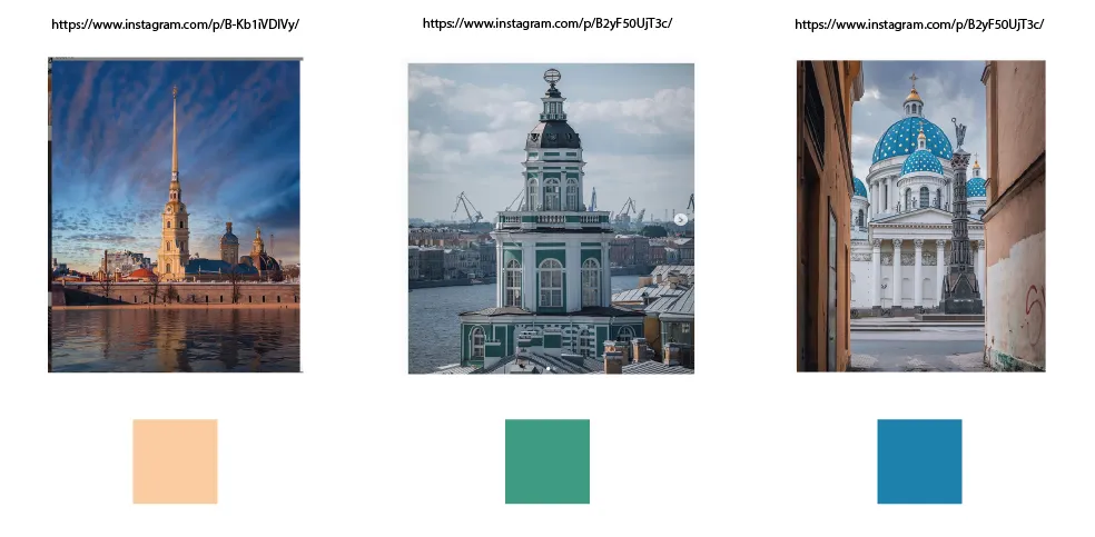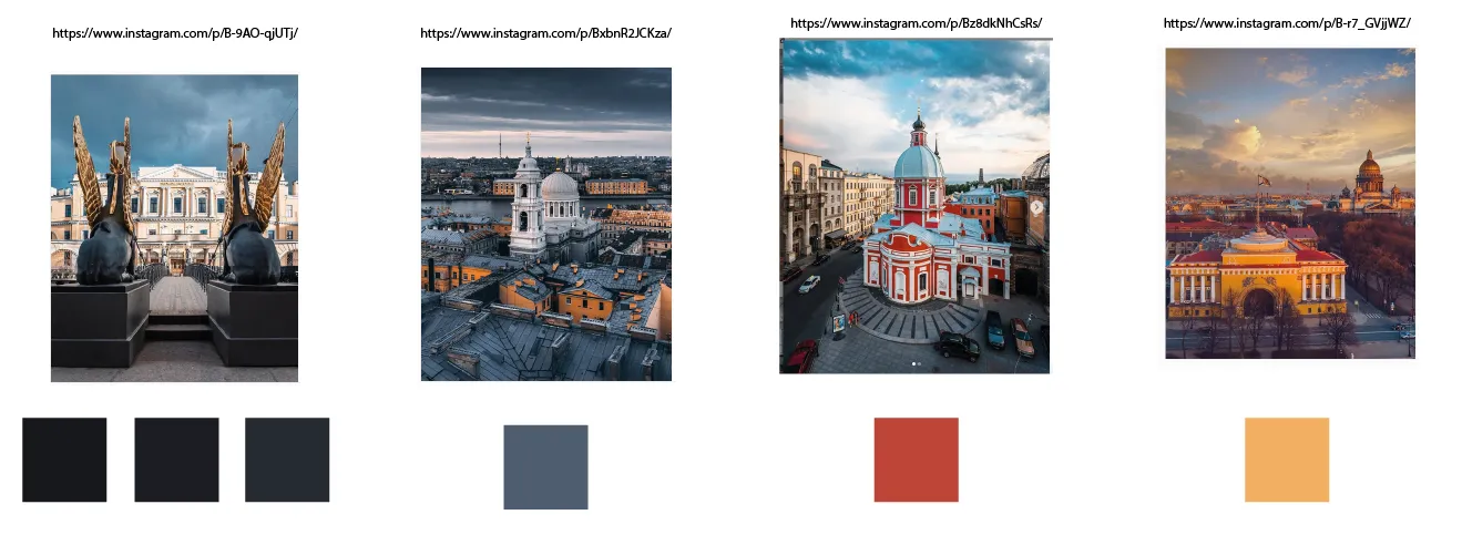 Задача — подобрать цвета для базовой карты и домов. Один из моих любимых фотографов Петербурга — Андрей Михайлов, цвета на его фотографиях созвучны с моим "чувством города". Из инстаграмма фотографа набираю картинки, чтобы выудить из них ключевые цвета.