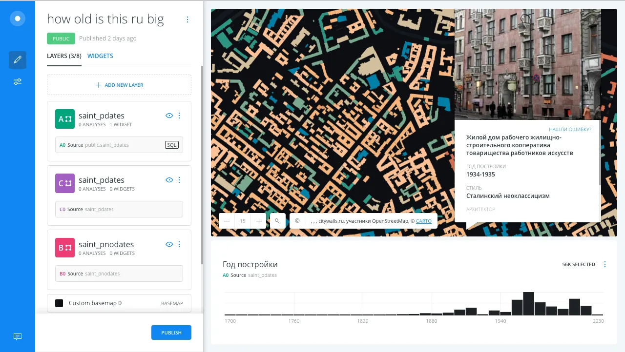 Верстаю сайт, вставляю карту с carto.com, делаю его двуязычным, подключаю комментарии, адаптирую под разные размеры экрана — вообще, процесс интересный. Результат — how-old-is-this.house