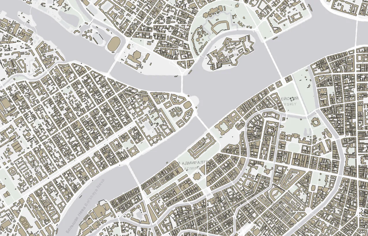 В первую очередь, готовлю слой зданий, который потом буду максимально наполнять атрибутами. Основа слоя — «Объектно-адресная система Санкт-Петербурга» с портала открытых данных Санкт-Петербура, геометрия детальная, видимо, из кадастровых паспортов, смотрится красиво, бонусом забираем все мосты. Максимально избавляемся от ненужных нам полигонов набережных, подъездных путей, площадок складирования и т.п.