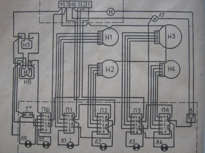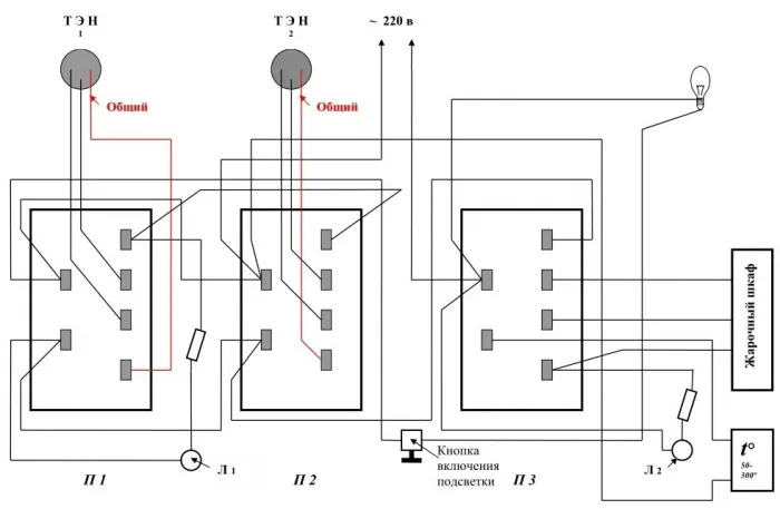За блокировку отвечает переключатель П5. Сигнальные лампы конфорок в схеме электроплиты это Л1-4. Пятая Л позволяет подсветить духовой шкаф. Также в наличии Л6. Она включается, когда в шкафу достигается соответствующая температура.