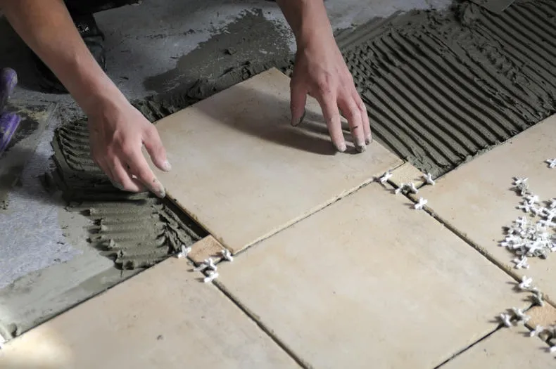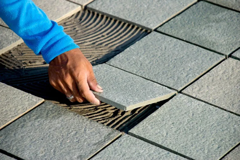 - Подготовительный этап, выбор нового материала, инструмента. Берется новая плитка, клеевой раствор, строительный уровень, аппарат для разрезания плитки, также следует обзавестись резиновым молотком, затиркой, другими вспомогательным элементами. С особой внимательностью выбирается клей, поскольку его качество напрямую связано со сроком службы покрытия. Осуществление монтажа.