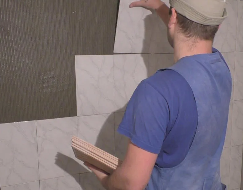 При слишком большом элементе клеевой раствор наносится на поверхность стены, плитку. Потом хорошо прижимается, должно быть ровное размещение. В основном прибивается рейка, для наглядного ориентира.