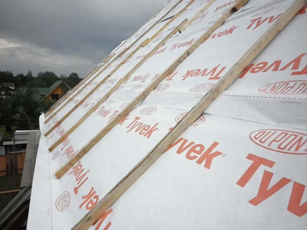 Стоит отметить, что первым покрытием поверх стропил должна быть гидроизоляционная и ветрозащитная пленка. Она прикрепляется к стропилам с помощью стиплера и скоб, начиная от карниза. Полотна настилаются внахлест (200 мм), а затем водостойким скотчем склеиваются стыки.