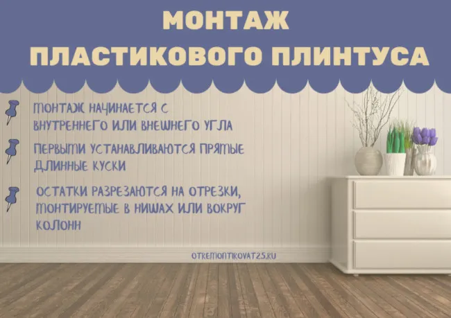 Монтаж плинтуса начинается с внутреннего или внешнего угла (при совпадении размеров возможна установка от двери). Первыми монтируются прямые длинные куски, потом, после тщательных замеров, остатки разрезаются на отрезки, монтируемые в нишах, вокруг колонн или на участках доводки. При всех способах плинтус разрезается под прямым углом (в этом плане пластиковые материалы легче деревянных в обработке, примыкаемых под углом в 45 °).